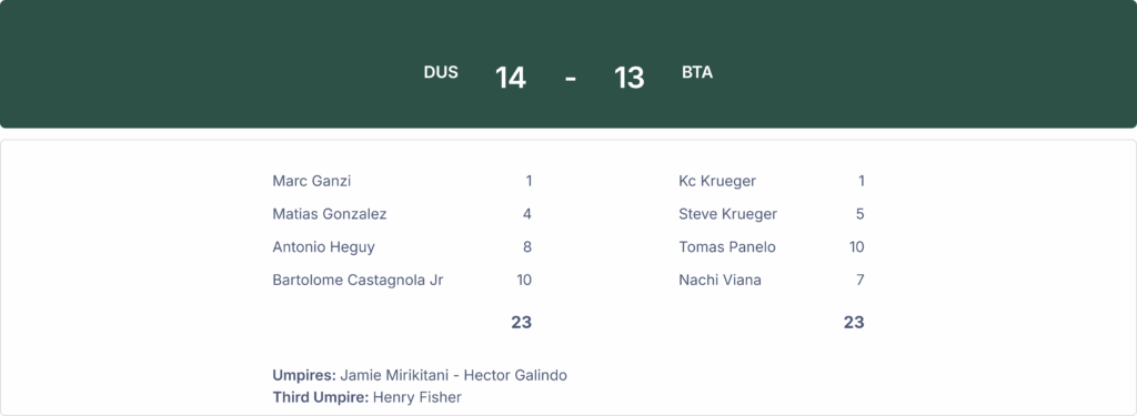 DUS won against BTA by a score of 14-13 in the U.S. Open Polo Championship at the National Polo Center on Thursday.