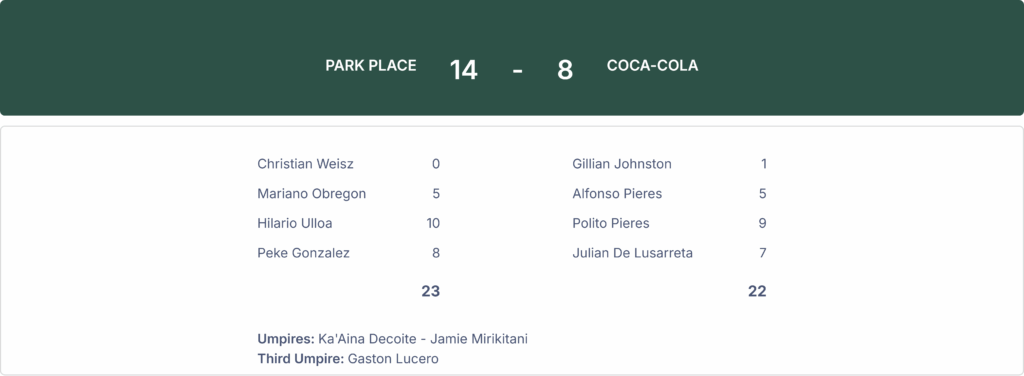 Park Place won against Coca-Cola by a score of 14-8 in the USPA Gold Cup at the National Polo Center on Tuesday.