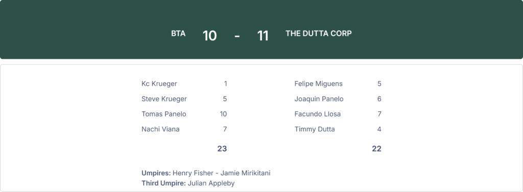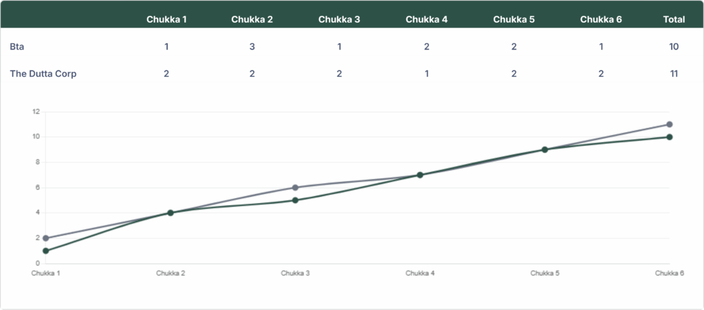 The Dutta Corp won against BTA by a score of 11-10 in the USPA Gold Cup at the National Polo Center on Thursday.
